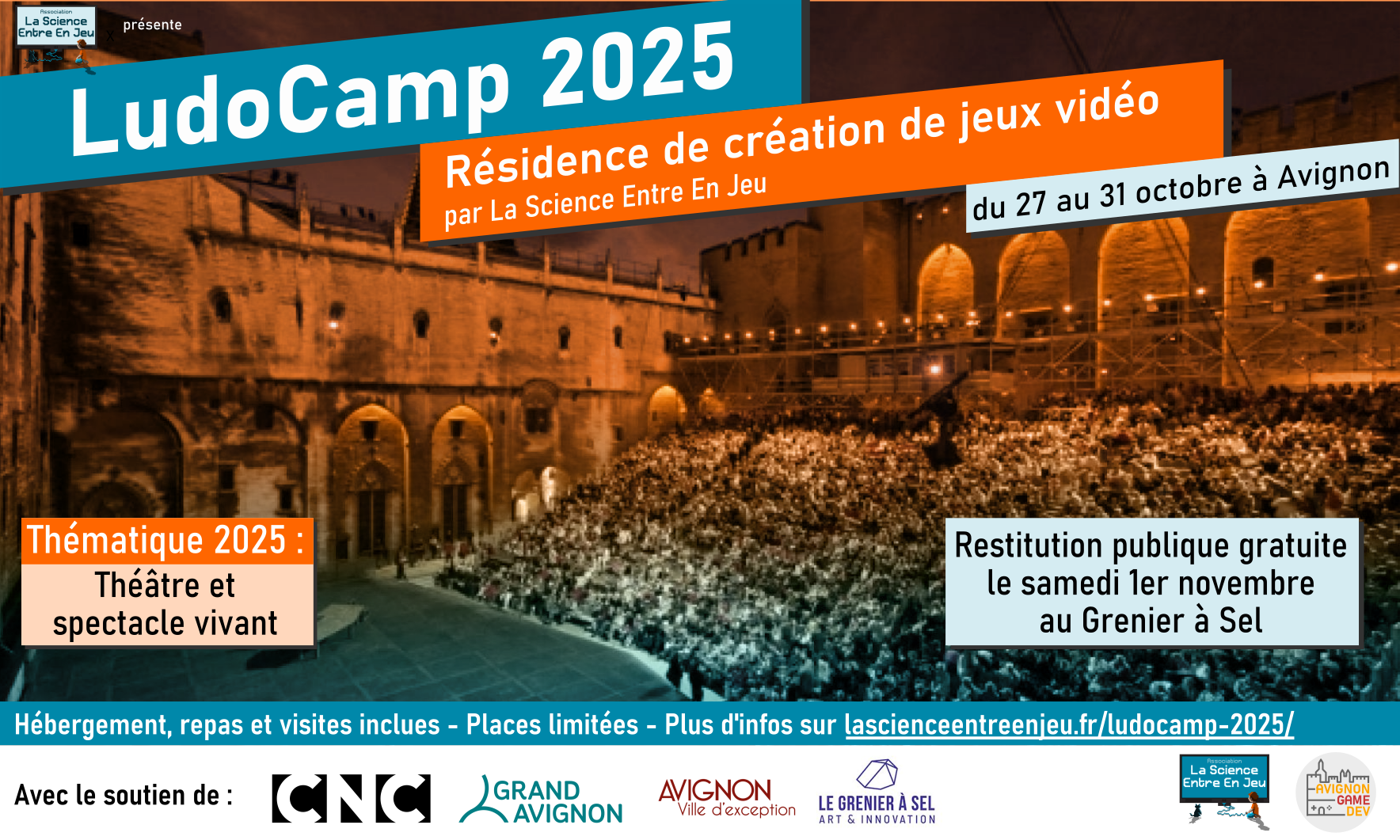 Le Ludocamp est une résidence de création de jeux vidéo thématiques. Cette deuxième édition a porté sur le théâtre et spectacle vivant. Elle a eu lieu en octobre 2025 à Avignon, avec 3 jeux réalisés.